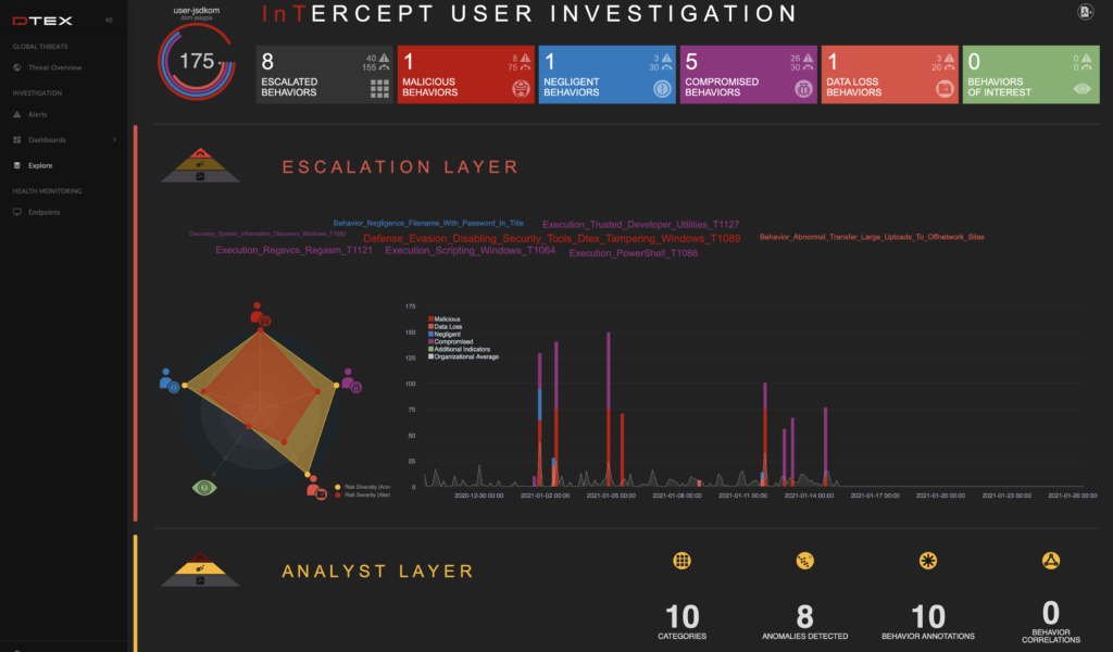 The second objective falls a bit short in our eyes. Gartner recommends, “tooling and staffing to be able to detect any signs of improper data exfiltration before it leaves the care and control of the organization.” Our experience, and that of our customers, has proven that using rules based on specific actions by specific individuals (or roles) on specific data results in false positives, creating alert fatigue for SOC and Insider Risk teams. A skilled attacker, whether a Super Malicious Insider or external attacker with stolen credentials, knows how to achieve their goals without alerting the SOC. A better approach is to understand each action in context of what’s happened before, after, and even in comparison to, the last few months, to identify Indicators of Intent as well as deviations from the norm. This means understanding each step an attacker can take and correlating those irrespective of the order in which those occur.