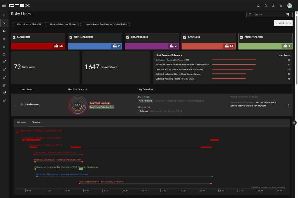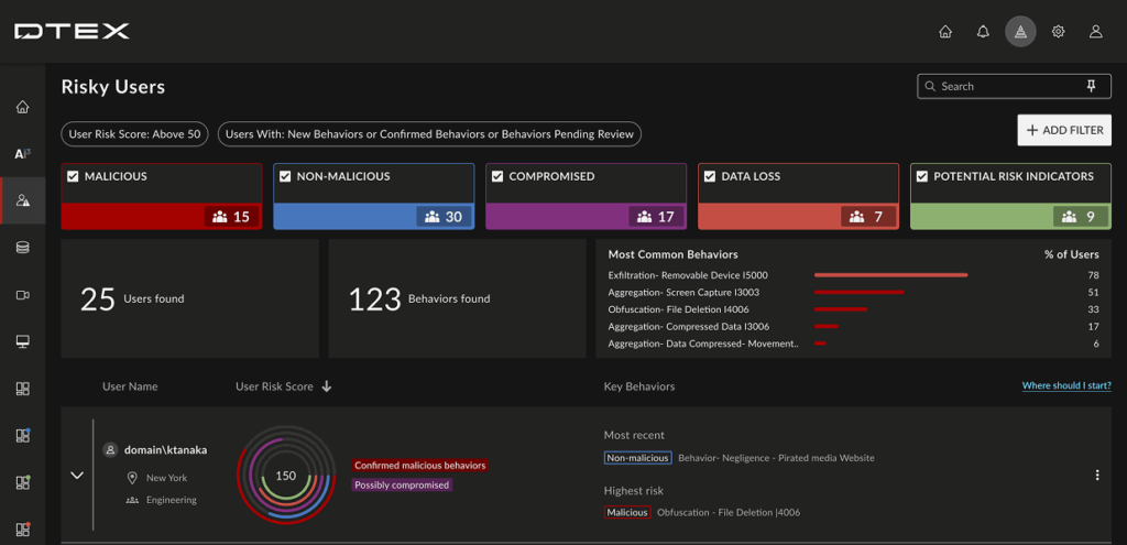 It’s exciting times for DTEX Insider Risk Management (IRM) users with the arrival of the new Risky Users dashboard, designed to simplify and connect useful information in a more analyst-centered workflow.