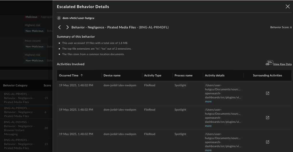 Digging into the collection of escalated behaviors, which comprise a collection of discrete activities, provides risky behavior details and an automated, easy-to-understand summary of the behavior in non-technical terms.