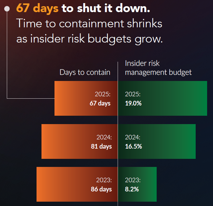 In addition, insider risk spend has risen to 19% of IT security budgets, a signal that many organizations now treat this as a core discipline rather than an adjunct function. As budgets increased, containment times dropped significantly.