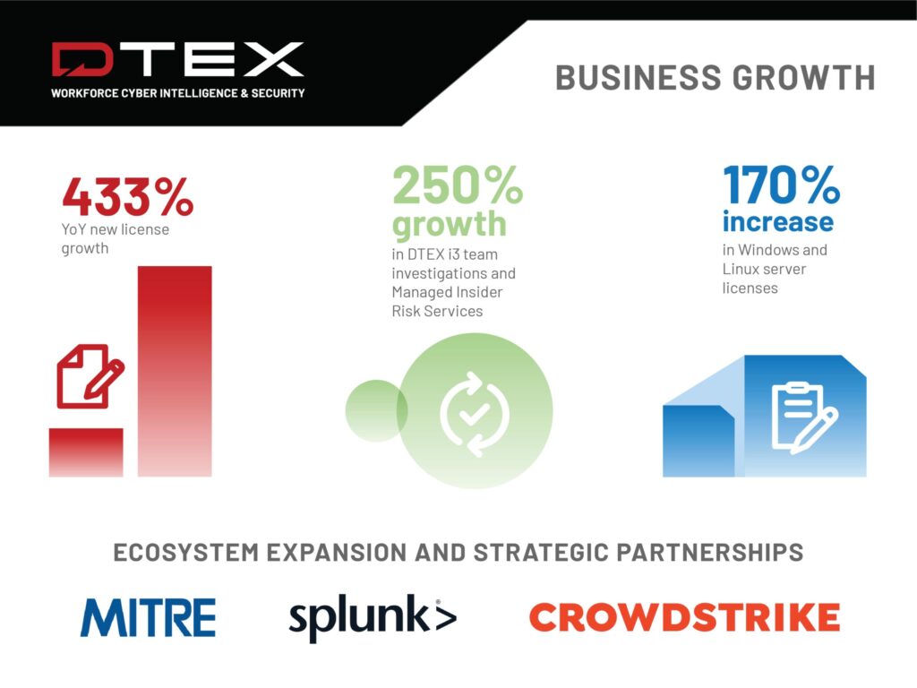 It has been a busy year on the partnership front. We formed a formal public-private partnership with The MITRE Corporation, to elevate insider risk programs and advance human-centric security. Under this partnership, MITRE chose DTEX to help them conduct collaborative research and deliver MITRE Inside-R Protect as a set of data-driven, community-oriented service offerings that help industry and government organizations elevate their insider risk programs using behavioral sciences. After inking a strategic partnership with Splunk to deliver insider risk solutions, DTEX announced its presence on the CrowdStrike App Store, expanding the reach of its next-gen Workforce Cyber Security platform through integrations with major players in the cyber security market.