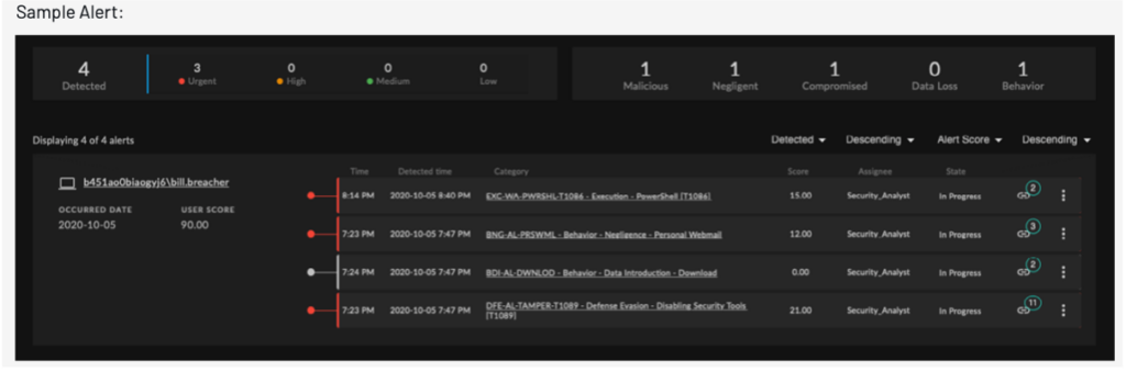Aggregation of risk scores and alert stacking provides actionable information regarding known and unknown insider threats. Outputs from the alert stacking algorithms can also be integrated into 3rd party SIEM platforms and data lakes.