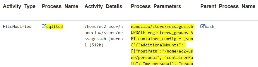 This indicator detects the multi-step workflow of mounting host directories into a NanoClaw agent container. This data exfiltration preparation indicator occurs when an insider or compromised account configures NanoClaw to access sensitive host directories (e.g., /home/ec2-user/personal) from inside the containerized agent, allowing the AI agent to read, process, and potentially exfiltrate files it normally cannot access.