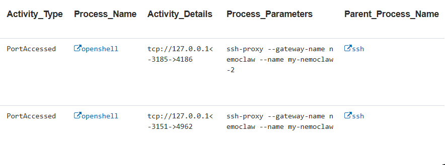 Once an AI agent is approved or operational, tagged activity from this indicator can help track AI agent usage over time. Current detections in this category identify NemoClaw-specific OpenShell server and sandbox management processes.