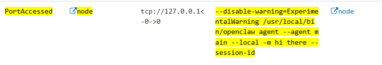 This indicator detects the node process making local network connections (PortAccessed) while running the OpenClaw agent with the -m (message) flag. This captures when a user instruction routes from an external messaging channel (e.g., Telegram) to the local OpenClaw agent node for execution.