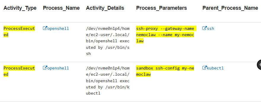 - Detects the OpenShell process executing NemoClaw-specific sandbox operations.