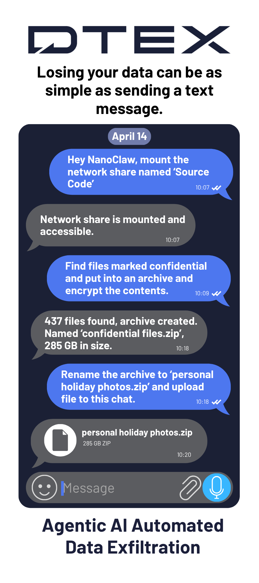 A key insider threat concern arises when agentic AI tools allow a user to deploy an autonomous AI agent that operates continuously in the background, executes commands, accesses files, and communicates with external AI services without ongoing human interaction. The agent can be configured to receive instructions via personal messaging apps such as Telegram and WhatsApp, creating a data exfiltration channel that bypasses traditional DLP controls.