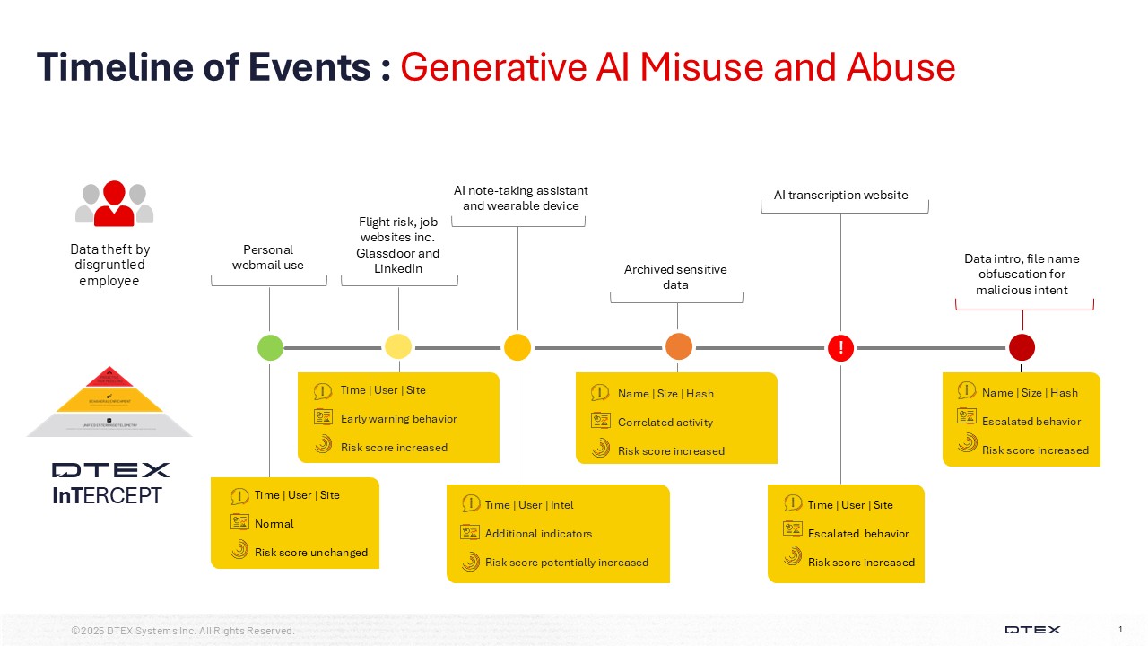 In our customer-facing version, we detail our investigation, beginning with the initial alert. The disgruntled employee demonstrated both technical skill and intelligence by aggregating data using Generative AI note-taking tools, both on and off corporate devices. They exfiltrated this data by employing their personal account for these cloud-based services.