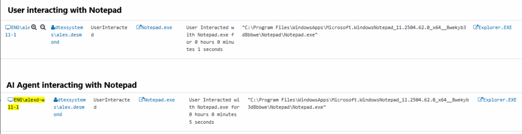 The main purpose of this agent is to assist with content generation and as seen in the example it can open file explorer and applications like notepad to then enter the content in. The activity itself is the same as what you would see for a user including the parent process.