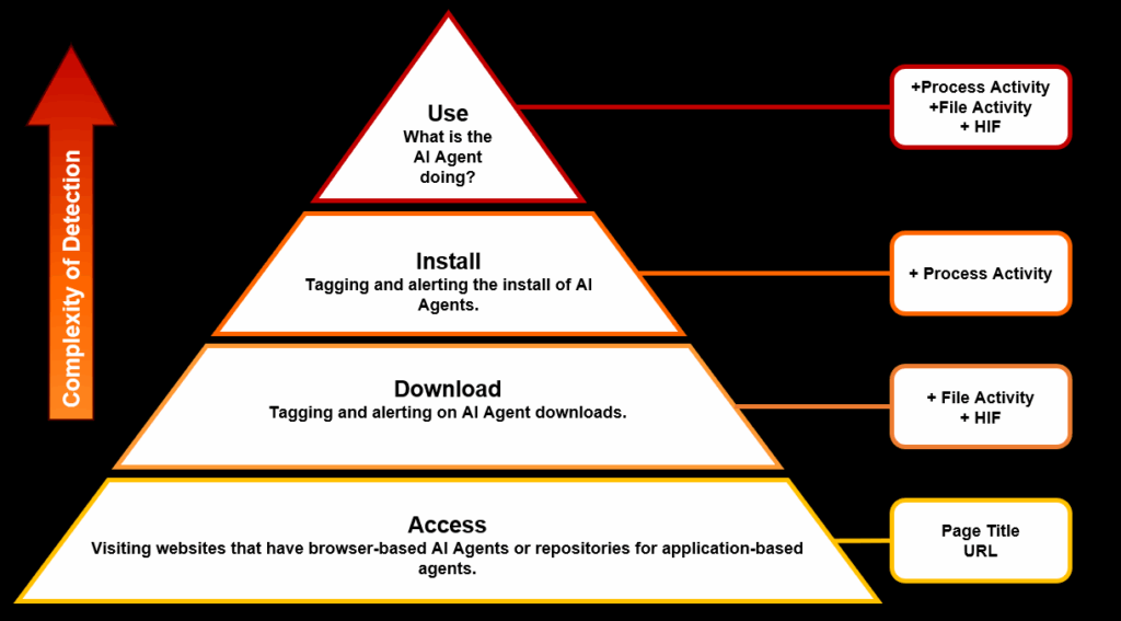 As we travel up the pyramid it becomes more difficult to detect AI agents and DTEX requires more functions and modules to accurately tag and alert on activity. For example, access will be tracked through web page accessed activity, however moving to the Use in the context of browser-based AI agents organizations will require HTTP Inspection Filtering rules profiled and enabled.