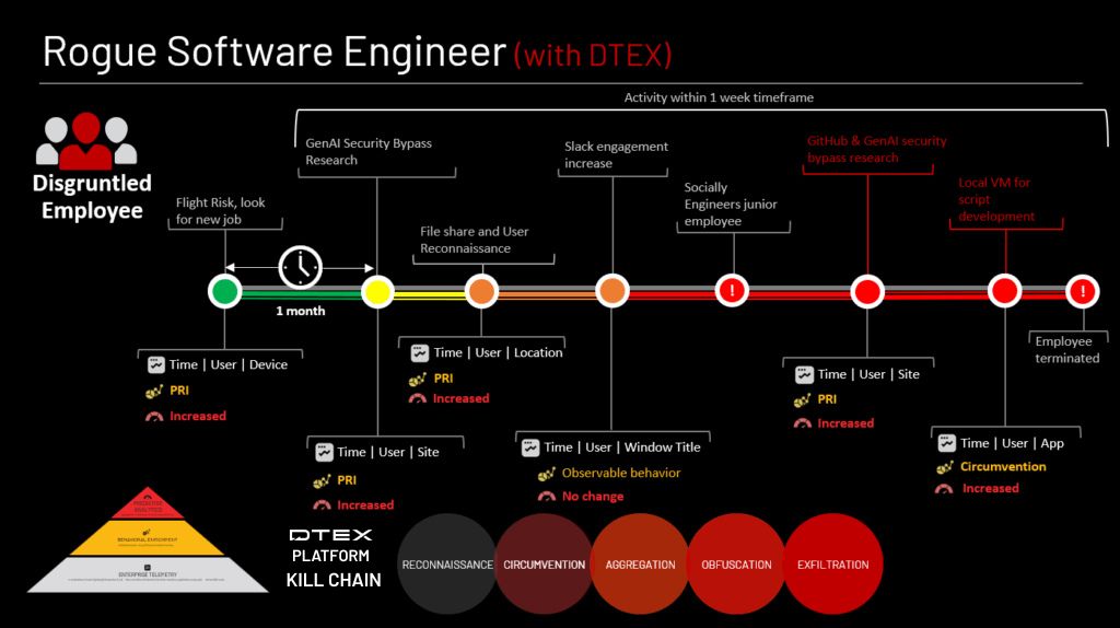 This investigation maps two distinct personas to different phases of the insider’s behavior. From the initial signs of flight risk up to the week before termination, the individual aligned with the Disgruntled Employee persona. As they began researching methods to bypass security controls—leading up to their termination—they transitioned into the Malicious Insider persona.
