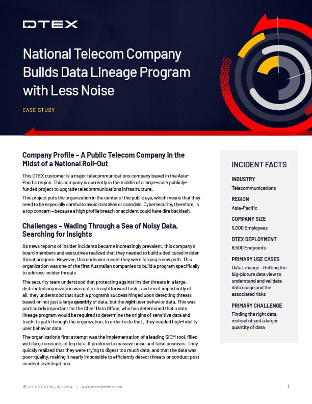 Organizations cannot wait for an adversary to execute the final steps of an attack. Instead, defenders must recognize the early warnings of an attack as soon as risk escalates. DTEX improves on a zero trust security model by surfacing behavioral indicators of intent from individuals with permissions on the inside, defending zero trust policies while keeping organizations left of boom.